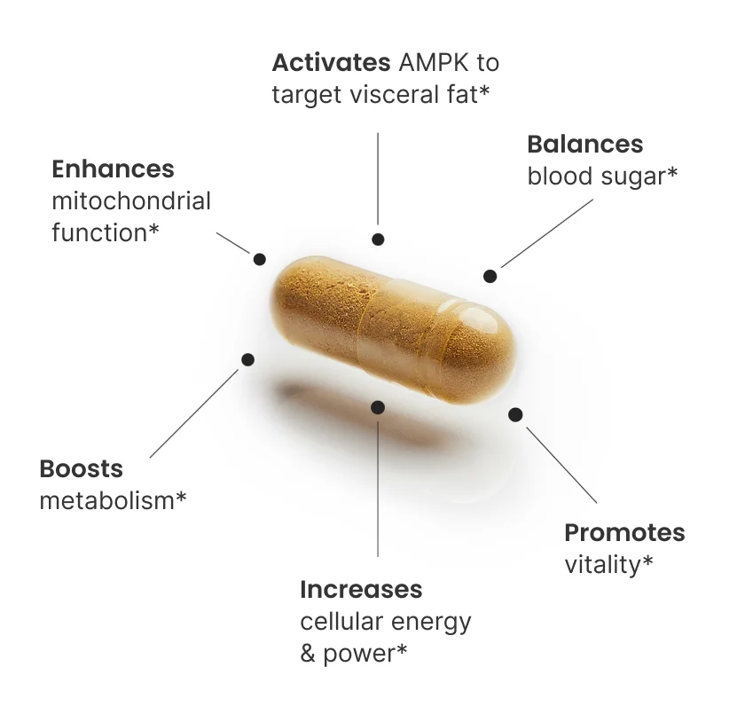 Give your body the cellular energy and power it deserves by turning on your metabolic switch (AMPK) to stop storing fat and starting burning it instead—all day long!* Simply take two capsules before your largest meal of the day.